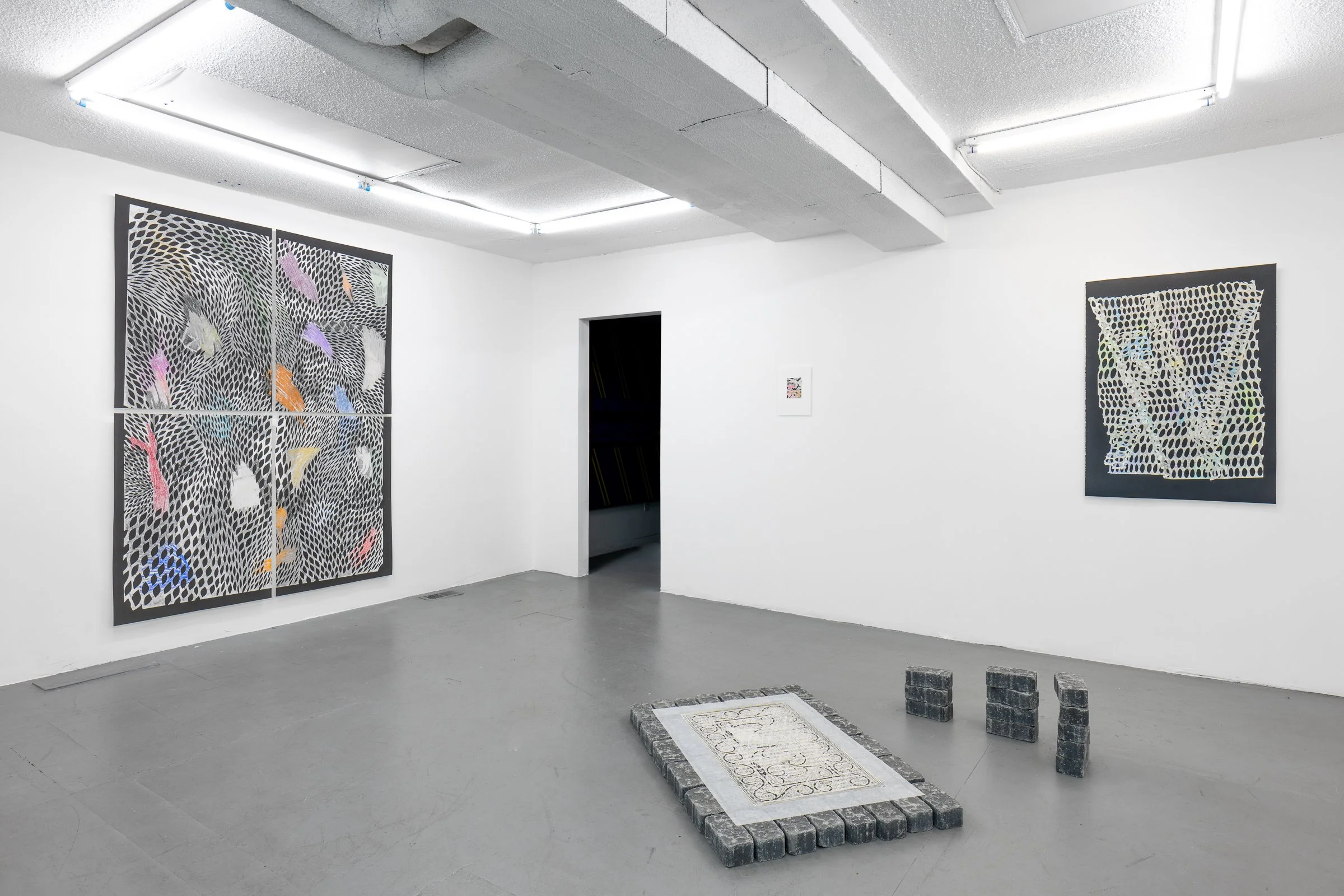Through a patchwork of screens - Mark and Sara-Jeanne in Quebec, Reyhan in Tehran -we came together to imagine a show that would bring forward works on paper: our shared admiration for print, handmade paper, and drawing, the everyday realities of parenthood, and our frustration with the state of the world.